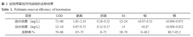 3. 不同雨水工程的污染物去除效果 3.1 生物滯留池 生物滯留池進(jìn)出水水質(zhì)與污染物去除率見(jiàn)表1。從表1可以看出,生物滯留池進(jìn)水水質(zhì)相當(dāng)于GB 3838—2002《地表水環(huán)境質(zhì)量標(biāo)準(zhǔn)》劣Ⅴ類,特別是COD較高,為72~86 mg/L,進(jìn)水水質(zhì)差主要是由工程匯水范圍內(nèi)車(chē)流量較大引起的。