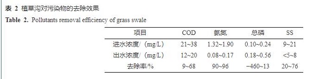 植草溝的進(jìn)出水水質(zhì)與污染物去除率見(jiàn)表2。從表2可以看出,進(jìn)水徑流中COD、氨氮濃度分別為21~38和1.32~1.90 mg/L。進(jìn)水污染物濃度相對(duì)較低,推測(cè)原因是匯水范圍內(nèi)道路車(chē)輛較少,且前期晴天日較短。對(duì)比COD、氨氮、總磷和SS 4種污染物,植草溝對(duì)氨氮的去除效果最好,平均去除率達(dá)到91.3%,平均出水濃度為0.12 mg/L。但是文獻(xiàn)報(bào)道的植草溝對(duì)氨氮的去除率相差較大,如楊銀川等[11]發(fā)現(xiàn)植草溝對(duì)氨氮的去除率達(dá)93%,而章茹等[18]研究表明,植草溝對(duì)氨氮的去除率僅為19%。與氨氮相似,SS和COD的去除效果在不同研究中也相差較大。本研究植草溝對(duì)SS和COD的平均去除率分別為51.9%和40.3%。荊武等[19]研究表明,植草溝對(duì)COD的去除率僅為4.3%,而付恒陽(yáng)等[20]研究結(jié)果為76.5%。不同研究中植草溝的污染物去除效果差別較大,主要是因?yàn)橹膊轀辖Y(jié)構(gòu)相對(duì)簡(jiǎn)單,抗沖擊能力較弱,降水強(qiáng)度、植物種類、進(jìn)出水方式等都會(huì)對(duì)其污染物去除效果產(chǎn)生影響。如下滲徑流與溢流徑流對(duì)污染物去除存在影響,研究表明下滲徑流相對(duì)于表面溢流徑流在污染物去除方面更有優(yōu)勢(shì),主要是因?yàn)橹参锔岛屯寥缹?duì)下滲徑流的過(guò)濾截留作用更明顯[21]。另有研究表明,降水強(qiáng)度越大,徑流污染的控制效果越差。如李海燕等[22]實(shí)地監(jiān)測(cè)并分析了植草溝在暴雨事件中的凈化效果,結(jié)果表明,SS、氨氮、COD的平均去除率僅有10%~35%。