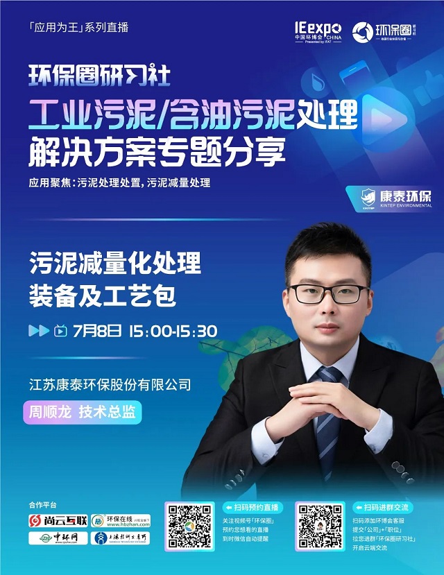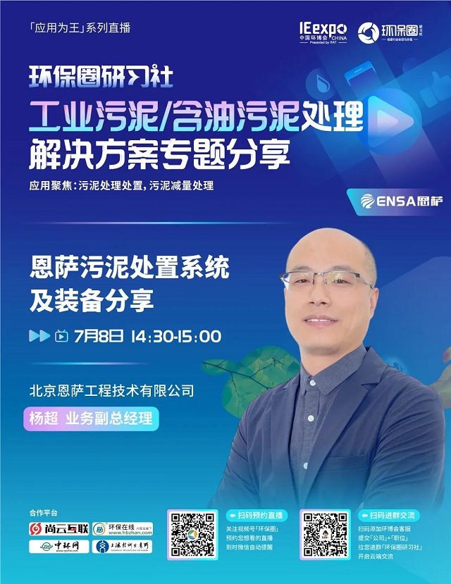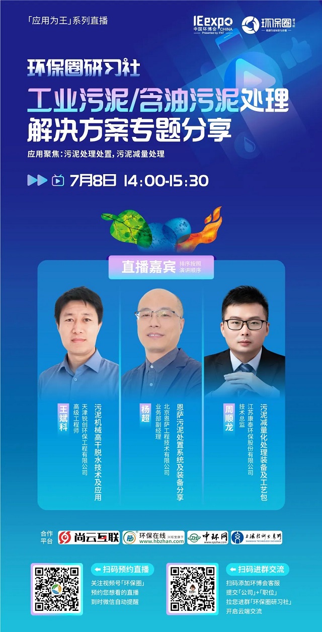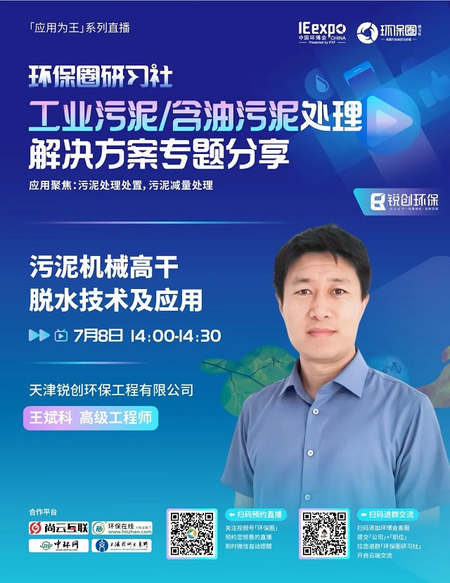 7月8日(星期五)下午14:00-15:30,環(huán)保圈研習社“應用為王”系列直播工業(yè)污泥/含油污泥處理解決方案專題分享,有幸邀請到了銳創(chuàng)環(huán)保、北京恩薩、江蘇康泰環(huán)保3家企業(yè)的技術專家做客直播間,聚焦工業(yè)污泥/含油污泥處理,為大家分享污泥處理處置,污泥減量處理解決方案。