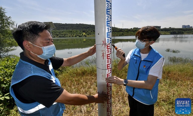 9月8日,管護人員在檢查阜石路西郊雨洪調蓄工程的水位測量設備。