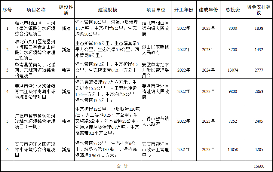 安徽省2022年重點流域水環境綜合治理中央預算內投資計劃擬安排情況公,顯示6個項目共獲得1.56億元資金,包括污水管網建設、垃圾清理、人工濕地建設等。