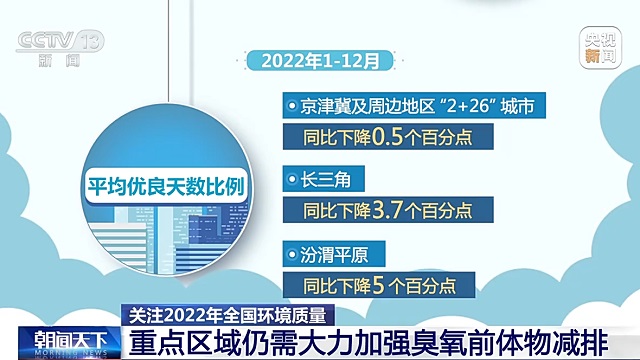 中國(guó)環(huán)境監(jiān)測(cè)總站大氣室主任 唐桂剛:優(yōu)良天數(shù)比例它主要是由六項(xiàng)污染物的濃度來判定,從以往來看的話,PM2.5一直都是發(fā)生超標(biāo)天的一個(gè)最重要的因素,但是隨著近年來大氣污染防治的不斷深入,PM2.5的超標(biāo)天的比例在不斷下降,2022年跟2021年相比,臭氧導(dǎo)致的超標(biāo)天增加了2.1個(gè)百分點(diǎn),這個(gè)就導(dǎo)致了2022年空氣質(zhì)量?jī)?yōu)良天數(shù)比例整體下降。