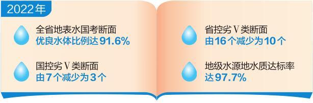 我省持續深入推進水污染治理,集中攻堅消除劣Ⅴ類水質斷面,全面提升水生態環境質量。2022年,4項約束性指標超額完成國考目標。其中,全省地表水國考斷面優良水體比例達91.6%;國控劣Ⅴ類斷面由7個減少為3個,省控由16個減少為10個,降幅明顯。地級水源地水質達標率達到97.7%。