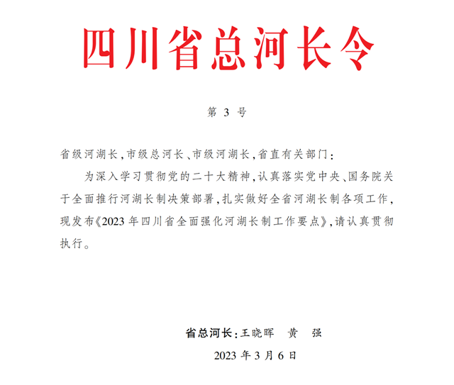 為深入貫徹落實(shí)黨中央、國務(wù)院和省委、省政府關(guān)于全面推行河湖長制的決策部署,根據(jù)《四川省全面落實(shí)河長制工作方案》(川委辦發(fā)電〔2017〕12號)《關(guān)于全面落實(shí)湖長制的實(shí)施意見》(川委辦〔2018〕33號)工作安排,持續(xù)強(qiáng)化全省河湖長制,統(tǒng)籌上下游、千支流、左右岸協(xié)同共治,推動(dòng)江河湖庫生態(tài)保護(hù)治理和休養(yǎng)生息,維護(hù)河湖健康生命。現(xiàn)結(jié)合我省實(shí)際,制定2023年度工作要點(diǎn)。