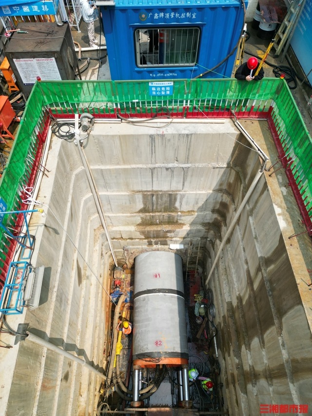 由長沙市芙蓉區(qū)朝陽路的一處圍擋而入,映入眼簾的是一處深基坑工作井。井深10米,井底有一條直徑2米、長267米的管道正在施工。三湘都市報記者隨后系上安全帶,佩戴防墜器,沿著梯子向下來到管道口。路面之上,車水馬龍,10米之下,只能隱約能聽到管道內(nèi)作業(yè)人員施工的聲音。