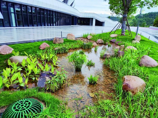 項(xiàng)目作為大型公共建筑,綠化灌溉和道路沖洗用水需求大。為減少自來水使用量,項(xiàng)目積極探索應(yīng)用智能化雨水回收利用系統(tǒng)。雨季利用建成的各類海綿設(shè)施,將雨水收集調(diào)蓄凈化后,通過自動(dòng)化系統(tǒng)實(shí)現(xiàn)系統(tǒng)的智能運(yùn)行,回用于場(chǎng)地綠化澆灌和道路沖洗,極大地節(jié)省了水資源。