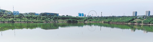 西郊雨洪調蓄工程阜石路砂石坑水面開闊,四周植被繁茂。