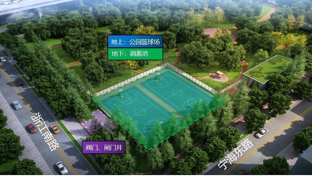 新延安東提標(biāo)調(diào)蓄池位于黃浦區(qū)延福公園西南角的籃球場(chǎng)下方,總占地面積2926.9平方米。通過(guò)打造一座“綠色”提標(biāo)調(diào)蓄池,并結(jié)合后期少量的管道翻排,能夠?qū)⑾到y(tǒng)內(nèi)排水能力由一年一遇提升至五年一遇,暴雨天啟用調(diào)蓄池后可有效提高系統(tǒng)的防澇能力,確保地區(qū)的防汛安全。同時(shí),項(xiàng)目結(jié)合公園籃球場(chǎng)建設(shè),通過(guò)服務(wù)周邊居民,打造環(huán)境改善、休閑活動(dòng)、城市形象多元化功能體系,實(shí)現(xiàn)中心城土地集約化開(kāi)發(fā)利用,為中心城區(qū)綠色調(diào)蓄設(shè)施的布局建設(shè)作出了良好的示范。