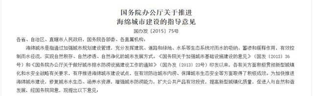 國務(wù)院辦公廳2015年10月印發(fā)《關(guān)于推進(jìn)海綿城市建設(shè)的指導(dǎo)意見》(國辦發(fā)﹝2015﹞75號),部署推進(jìn)海綿城市建設(shè)工作。
