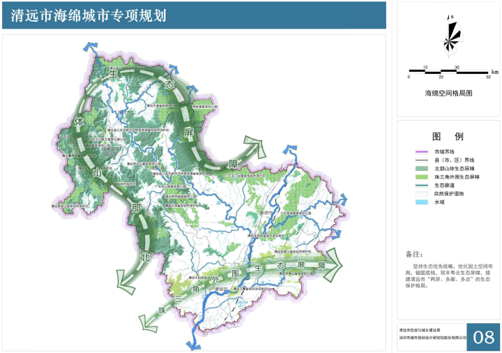 根據《規劃》,清遠將構建“兩屏、多廊、多點”的海綿生態空間格局?!皟善痢奔幢辈凯h形生態屏障和珠三角外圍生態屏障。強化與周邊連綿山體的空間銜接和協同治理,推進南嶺、筆架山、三桂山等山體屏障的生物多樣性保護、水土保持及水源涵養,筑牢生態安全屏障,以限制城鎮建設無序擴張。生態屏障內限制開發建設行為,針對連接屏障之間的耕地、城鎮等用地進行嚴格管控,禁止破壞生態安全的活動,保障屏障的連續性和生態安全格局的完整性。