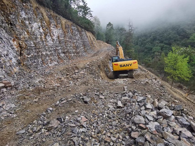 圖為河池市生態(tài)環(huán)境局指導(dǎo)項(xiàng)目實(shí)施方對(duì)三鏡巖溶洼地開(kāi)展進(jìn)場(chǎng)道路修建。