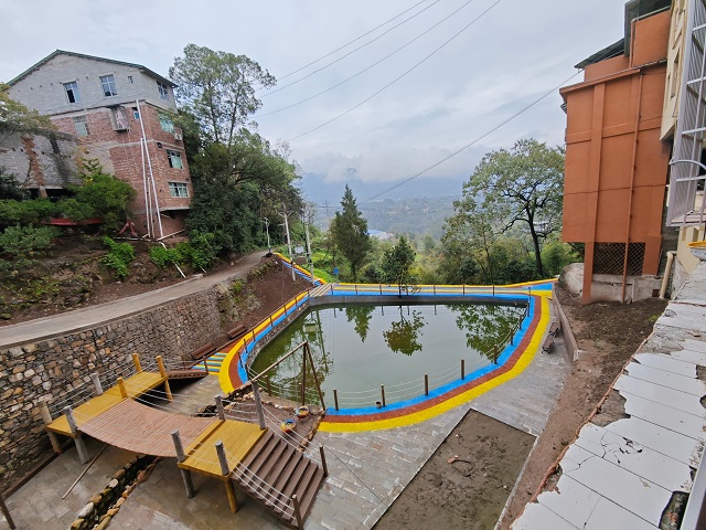 重慶市武隆區鳳來鎮,山清水秀,別有一番滋味。在臨江村的豬市壩山坪塘,水波青綠透亮,塘邊安裝了一圈護欄,修建了一條三彩步道,還設置了座椅、輪胎秋千等休閑設施,宛如一個小小的公園。
