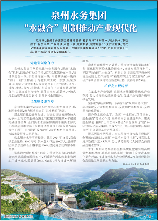 立足水務(wù)產(chǎn)業(yè)資源,泉州水務(wù)集團持續(xù)優(yōu)化產(chǎn)業(yè)布局,努力培育新的經(jīng)濟增長點,促進產(chǎn)業(yè)轉(zhuǎn)型升級和綠色發(fā)展。