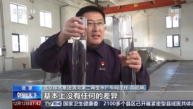 北京排水集團(tuán)清河第二再生水廠車間主任劉屹坤:再生水和自來水從感官感覺來講,基本上沒有任何差異。同時(shí)在這個(gè)水里投加了相應(yīng)的消毒劑,殺死對人體有害的細(xì)菌、病毒。