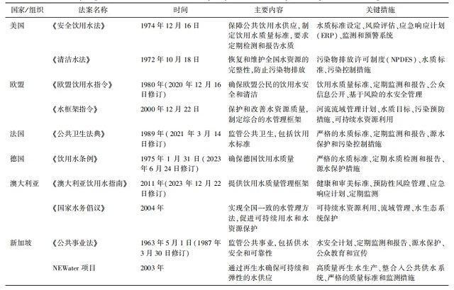 發達國家依托法案法規制定了相應的飲用水質量標準:美國通過《安全飲用水法》設定了多種污染物的限值,顯著提升了水質;法國和德國依托《歐盟飲用水指令》,制定了高標準的水質限值,并通過嚴格的監測和管理措施,確保水質安全;澳大利亞依據《澳大利亞飲用水指南》,采用預防性風險管理和定期監測措施,提升自來水質量;新加坡根據WHO的指導,制定了嚴格的水質標準,通過NEWater項目和綜合水管理體系,確保高質量的飲用水供應(表4)。