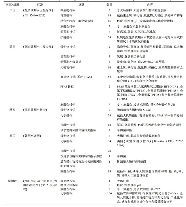 在制定保護水質的法規和標準時,我國主要參考了美國、歐洲、WHO、俄羅斯和日本的相關規范,遵循了與美國類似的原則,水源水質管理則遵循《生活飲用水衛生標準》(GB5749—2006)和《地表水環境質量標準》(GB3838—2002),并于2022年將《生活飲用水衛生標準》(GB5749—2006)更新為《生活飲用水衛生標準》(GB5749—2022),新標準對各類污染物的限值做出了嚴格規定,涵蓋了微生物、重金屬、化學物質和有機污染物等多個方面。這一標準的修訂不僅提高了水質管控要求,也響應了新污染物的控制,進一步完善了我國的飲用水質量管理體系。