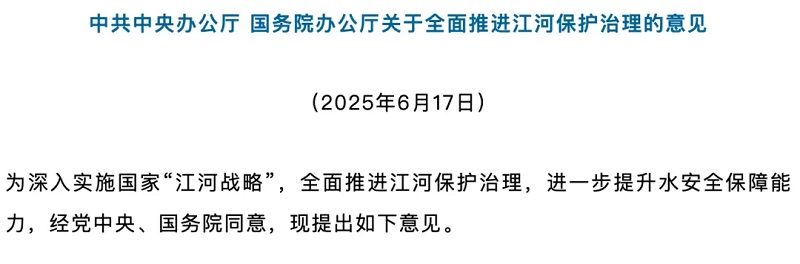 首次明確將流域綜合治理 提升至國(guó)家戰(zhàn)略高度 2025年6月17日,《中共中央辦公廳國(guó)務(wù)院辦公廳關(guān)于全面推進(jìn)江河保護(hù)治理的意見》(以下簡(jiǎn)稱《意見》)正式發(fā)布。