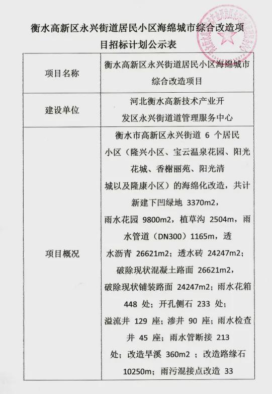 近日,衡水市公共資源交易平臺發(fā)布衡水高新區(qū)永興街道居民小區(qū)海綿城市綜合改造項目招標計劃公示。