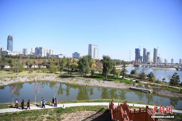 2020年10月22日,甘肅慶陽市“海綿城市”雨水蓄水地西峰區南湖吸引市民游玩。中新社記者楊艷敏攝